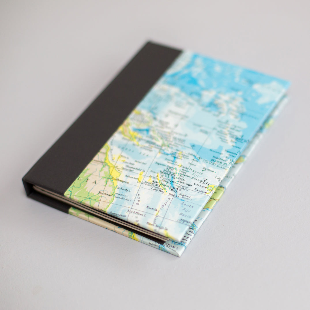 Learn how to make your own hardcover notebook using vintage maps and found papers. You’ll be introduced to the fundamentals of folding and cutting paper to be bound into a hardcover notebook with a quarter binding, to take home at the end of the session.