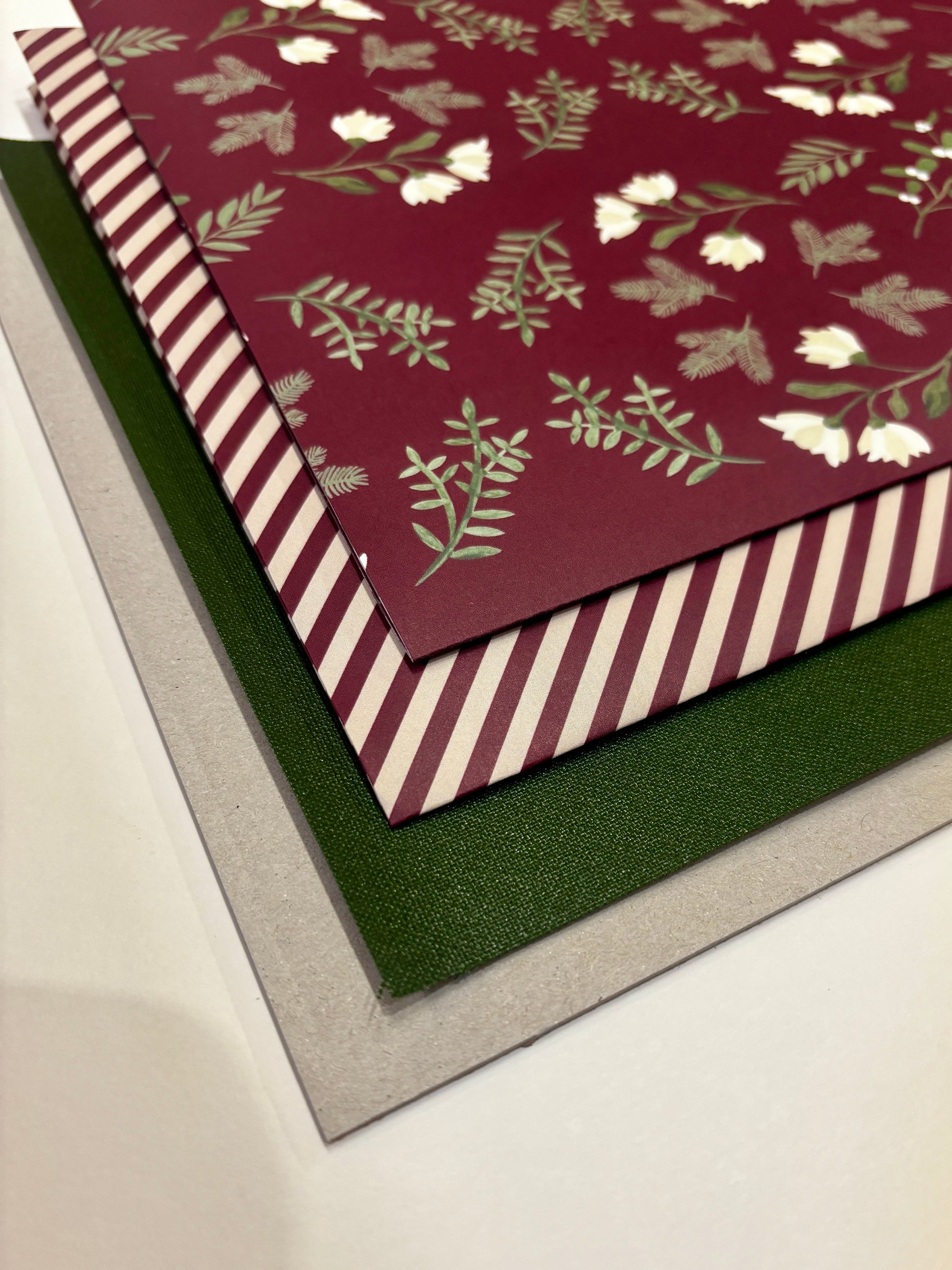 Our kit changes with each season. You will received patterned paper and coloured book cloth and ribbon in: